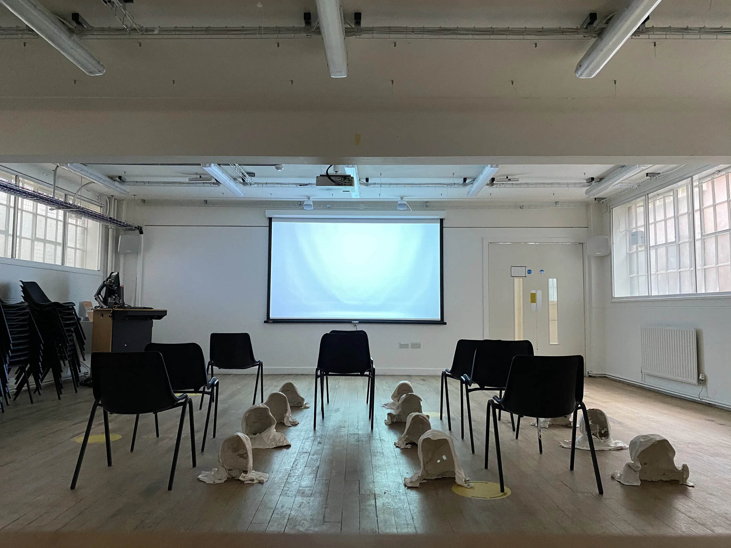 Knowing I have 12 cast clay hoods upstairs has intrigued me to bring them down to the seminar room and replace that which is missing. I wasn’t sure what the objective of today was. I started to investigate and traverse the ‘space’, explore the availability of openness and potentiality.